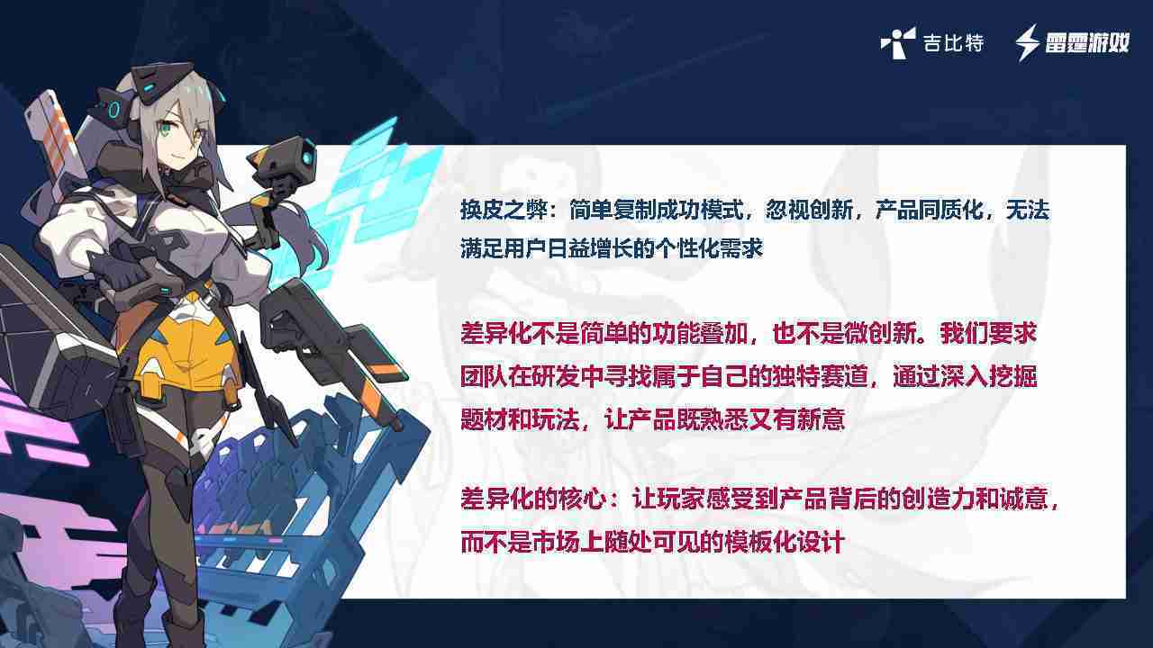 在我们内部是这么定义差异化的。。首先,,,差异化不是简单的功能叠加,,更不是换皮。。。只是换皮,,产品无法提供有效的市场价值。。内部经常说差异化的产品不是为了迎合市场,,,,而是找到一个自己独特的表达方式,,,在研发中找到属于自己的细分赛道和独特赛道,,,,前提是需要对这个题材有足够的深入、、、挖掘,,,对玩法有足够深入的理解,,,让产品看起来既熟悉又有新意。。。。