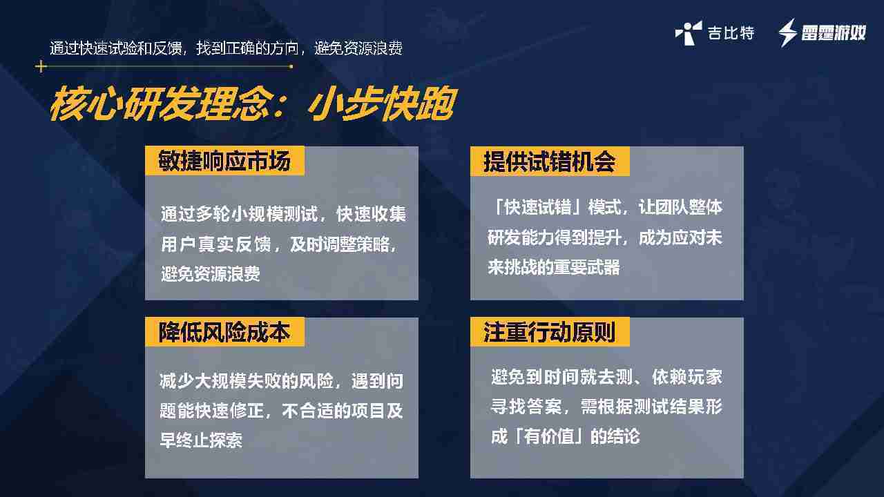 从目前的实践来看,,内容向确实不合适,,,因为小步快跑更适合做玩法的尝试,,,,但是如果是内容项,,玩法已经确定的,,,,这时候应该做切片,,而不是做小步快跑的方式,,因为做切片的成本是很高的。。。我们有过两个项目,,,,要花很长时间做切片的内容,,,,而切片内容只占整个项目的1/10,,但要花的时间成本、、、、人力成本、、、经济成本可能会到1/3,,,所以用很短的时间做游戏的原型,,,,验证其好不好玩,,,,是想尝试在粗糙表达的情况下,,看看能否获得非常好的留存表现。。如果留存表现非常好,,,证明游戏内容体验是比较准确和非常好的内核,,,我们会尝试加外围内容的拓展。。