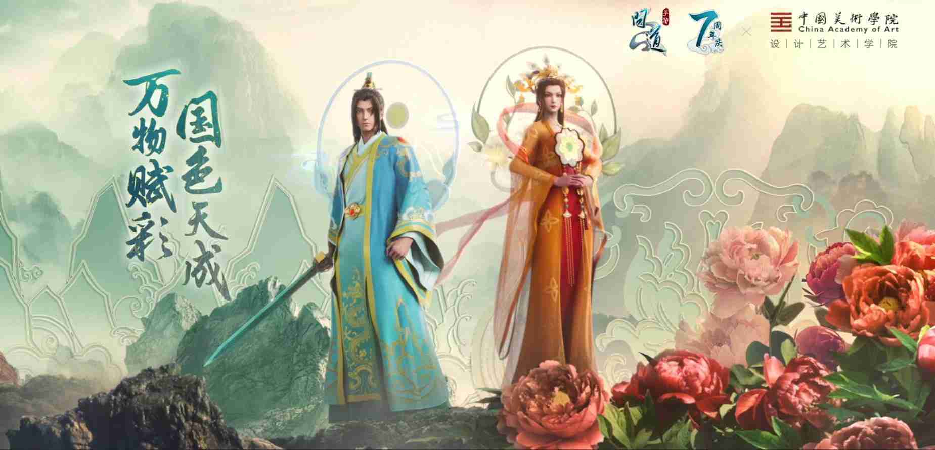 2023年4月,,《问道手游》联动中国美术学院,,在游戏中融合了中国历史上不同时期的文化元素,,打造了“山河万象”与“凤鸣九霄”的国风时装。。在色彩配置方面,,创作团队基于对游戏角色特性的分析提取相应的文化内涵,,,从每一种色彩的色相、、指代事物和情感出发对应角色属性,,,,选定服装的色彩搭配。。在纹样设计方面,,,创作团队结合游戏角色自身特殊的造型比例和形态,,,,在实际的纹样设计中进行了游戏语境下的活化演绎。。。男性角色集中使用了如蟒纹、、、、海水江崖纹、、、、如意纹和云气纹等传统纹样元素,,女性角色则吸纳了凤凰纹、、、牡丹纹、、卷草缠枝纹等元素,,,组成以“双凤牡丹纹样”“缠枝牡丹纹”“金玉凤冠头饰”为主要纹样的游戏角色装饰图案系统。。。。