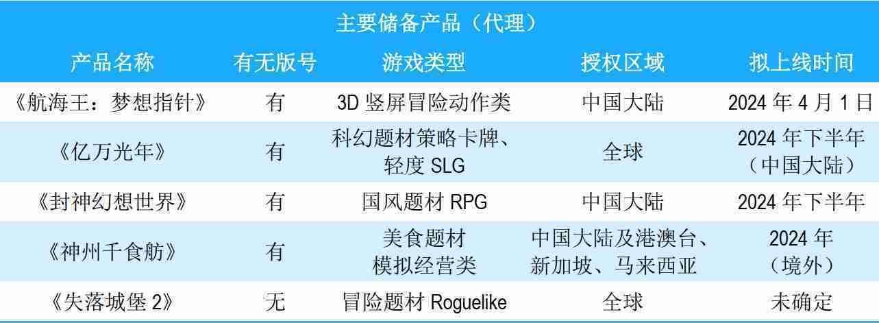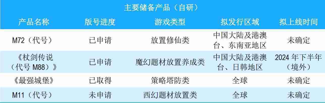公司储备的多个自研、、、、代理产品都在有序推进当中,,,涵盖放置类、、、策略类、、、、模拟经营类、、、、RPG、、、、Roguelike等多元化游戏品类,,储备的主要自研和代理产品如下::::
